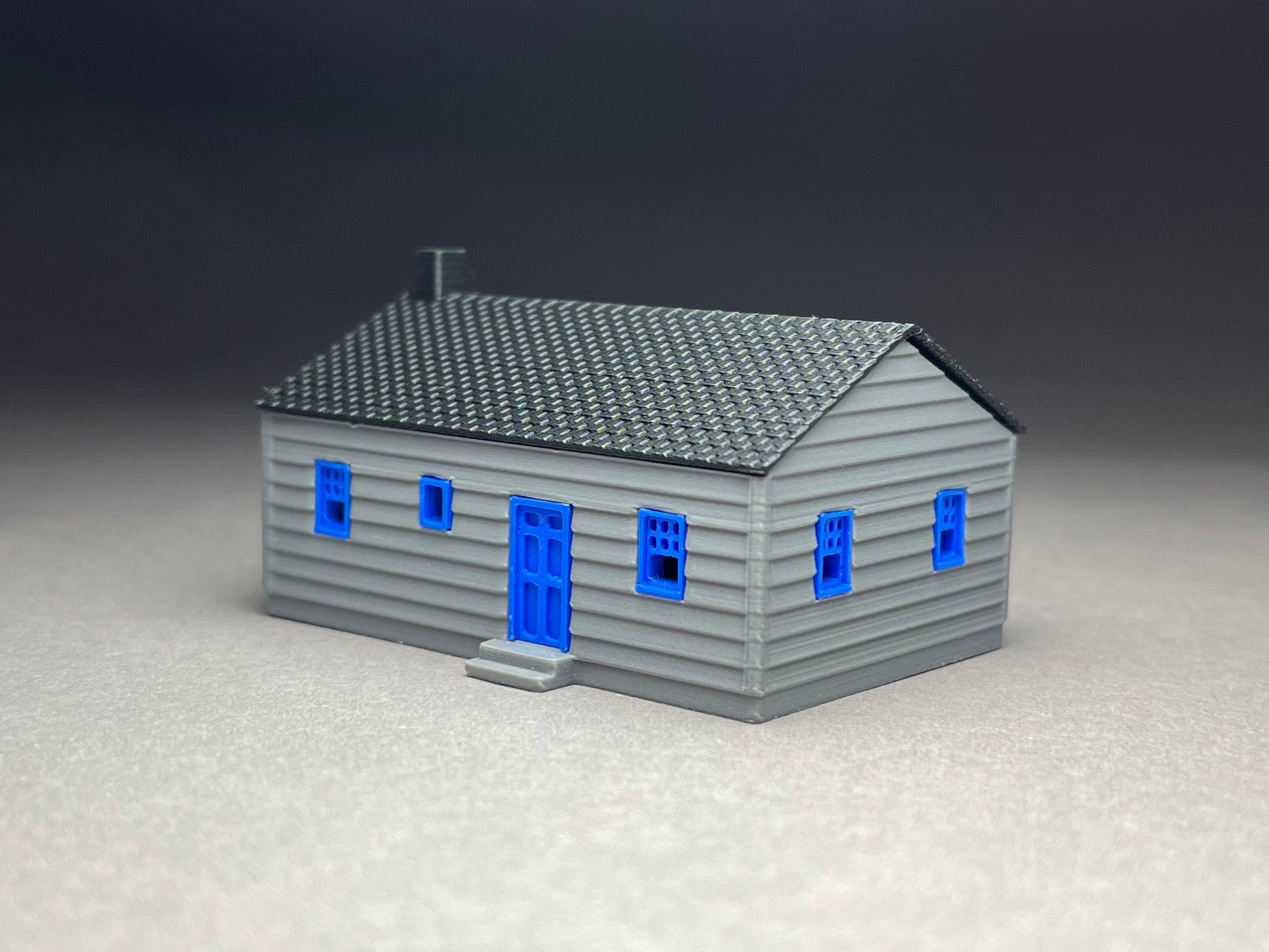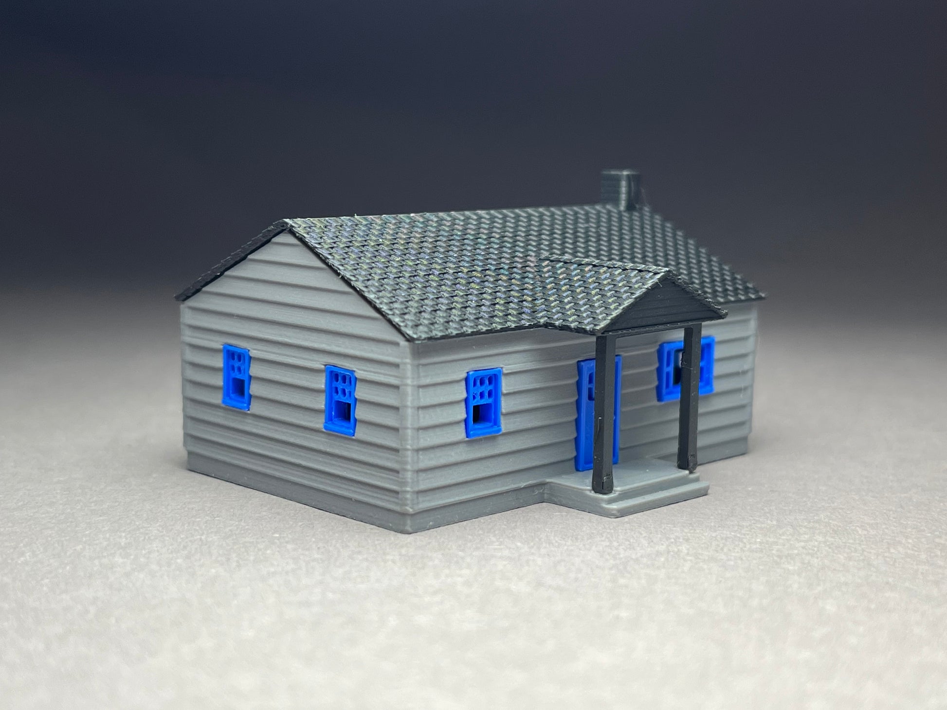 Traditional crackerbox house. These were commonly built post WW2 as a affordable house for returning GIs. The house is printed in 3 different colors - dark gray roof, gray siding and windows and doors in random color. Easy to paint, but can be displayed as-is if you are in hurry! Hollow bottom for lights.